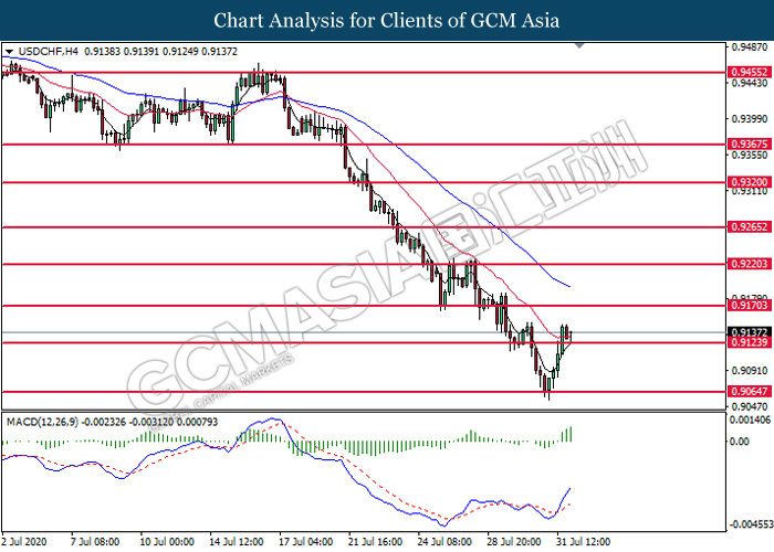 USDCHF, H4: USDCHF telah didagang dengan lebih tinggi selepas ia memecah tahap rintangan sebelumnya di 0.9125. MACD yang memaparkan isyarat momentum bullish yang berterusan mencadangkan pasangan ini untuk didagang dengan lebih tinggi dan menuju ke arah tahap rintangan di 0.9170.