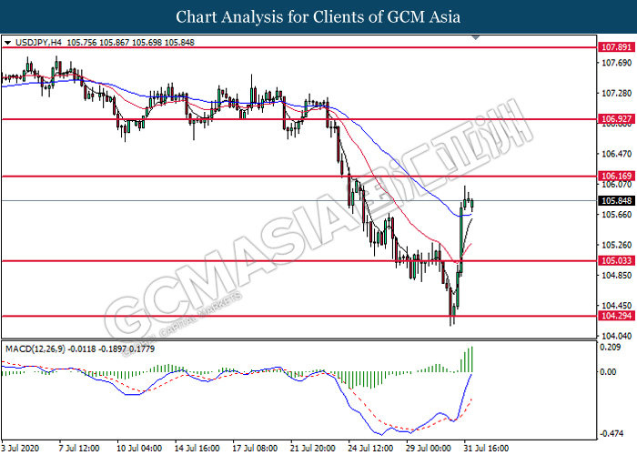 USDJPY, H4: USDJPY telah didagang dengan lebih tinggi selepas ia memecah tahap rintangan sebelumnya di 105.00. MACD yang memaparkan isyarat momentum bullish yang berterusan mencadangkan pasangan ini untuk didagang dengan lebih tinggi dan menuju ke arah tahap rintangan di 106.15.