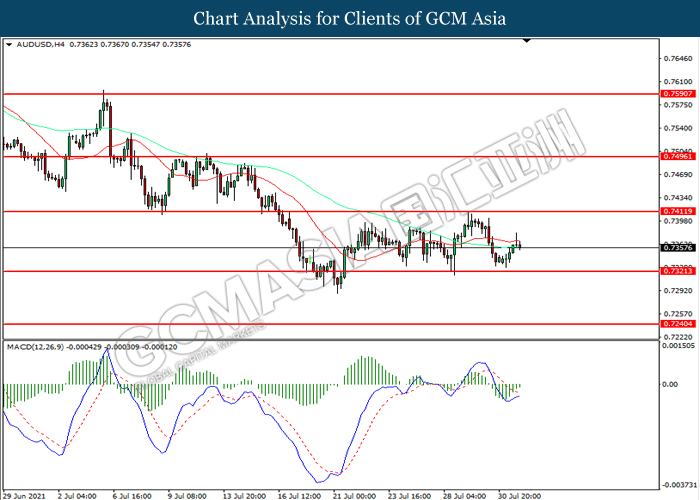 AUDUSD, H4: AUDUSD telah didagang dengan lebih tinggi selepas ia melantun dari tahap sokongan 0.7320. MACD yang memaparkan momentum bearish yang berkurangan mencadangkan pasangan ini untuk melanjutkan keuntungannya ke arah tahap rintangan 0.7410.