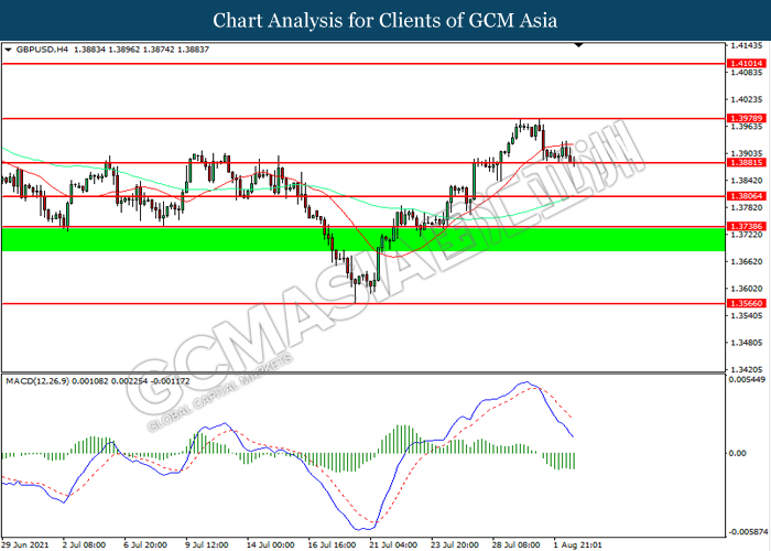 GBPUSD, H4: GBPUSD telah didagang dengan lebih rendah sementara kini menguji di tahap sokongan 1.3880. MACD yang memaparkan momentum bearish mencadangkan pasangan ini untuk melanjtukan kerugiannya selepas ia memecah tahap sokongan tersebut.