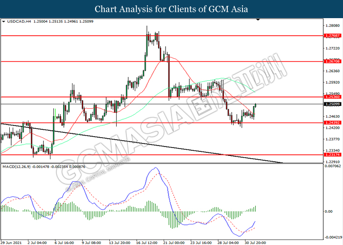 USDCAD, H4: USDCAD telah didagang dengan lebih tinggi selepas ia melantun dari tahap sokongan 1.2440. MACD yang memaparkan momentum bullish mencadangkan pasangan ini untuk melanjutkan keuntungannya ke arah tahap rintangan 1.2535.