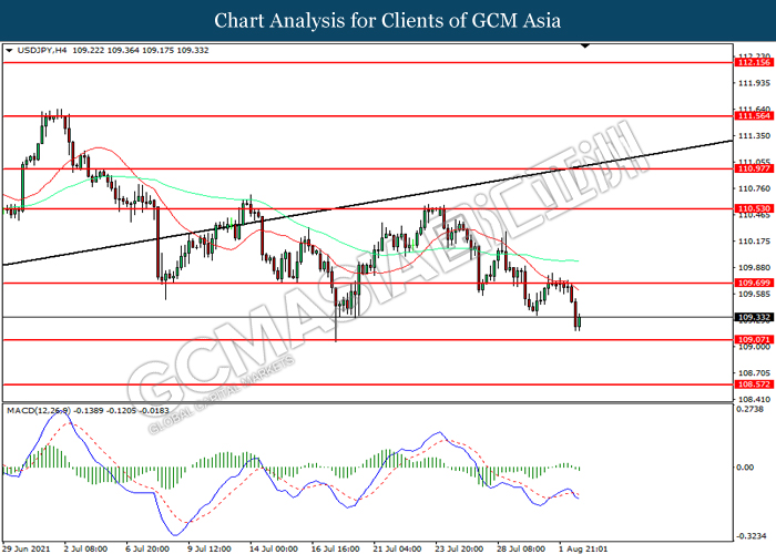 USDJPY, H4: USDJPY telah didagang dengan lebih rendah sementara kini berhampiran dengan tahap sokongan 109.05. MACD yang memaparkan momentum bearish mencadangkan pasangan ini untuk melanjutkan kerugiannya selepas ia memecah tahap sokongan tersebut.