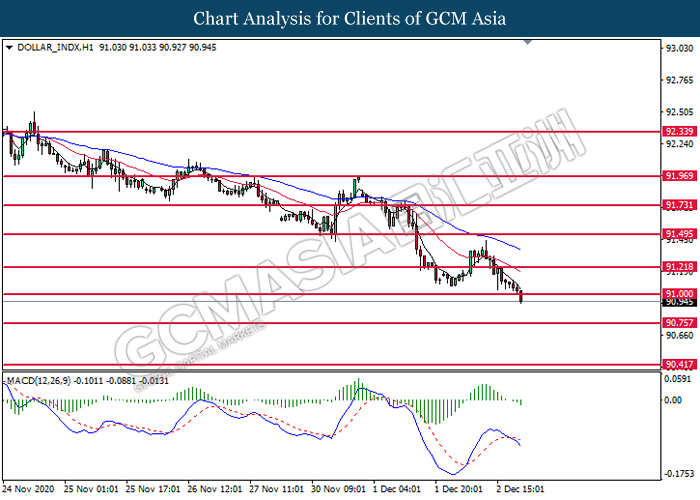 Di pasaran komoditi, harga minyak mentah meningkat 0.24% ke $45.15 setong selepas jatuh sebanyak 2.50% peratus di tengah penurunan inventori minyak mentah AS yang lebih rendah daripada yang dijangkakan. Menurut EIA, data stok simpanan minyak mentah AS dibebaskan pada -0.679M, lebih rendah daripada jangkaan ekonomi iaitu pada -2.358M. Namun, kelulusan vaksin UK berjaya memulihkan kerugian produk minyak ini kerana ia meningkatkan harapan dalam pemulihan permintaan. Selain itu, harga emas turun 0.07% ke $1829.65 setroy auns setelah UK meluluskan vaksin yang dihasilkan oleh Pfizer dan BioNtech.