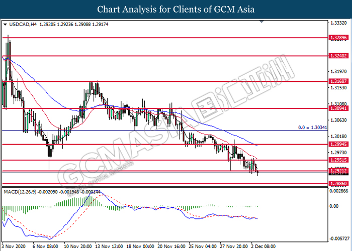 USDCAD, H4: USDCAD telah didagang dengan lebih rendah sementara ia sedang menguji tahap sokongan di 1.2920. MACD yang memaparkan isyarat momentum bearish signal mencadangkan pasangan ini untuk melanjutkan kerugiannya selepas lilinnya berjaya menutup di bawah tahap sokongan.