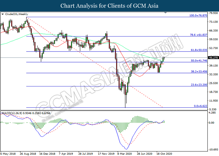 CrudeOIL, Weekly: Harga minyak mentah telah didagang dengan lebih tinggi selepas ia memecah tahap rintangan terdahulu 41.75. MACD yang memaparkan momentum bullish mencadangkan komoditi ini untuk melanjutkan keuntungannya ke arah tahap rintangan 50.05.