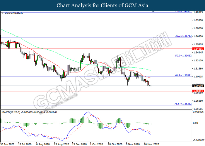 USDCAD, Daily: USDCAD telah didagang dengan lebih rendah selepas ia memecah tahap sokongan terdahulu 1.3060. MACD yang memaparkan momentum bearish mencadangkan pasangan ini untuk melanjutkan kerugiannya ke arah tahap sokongan 1.2835.