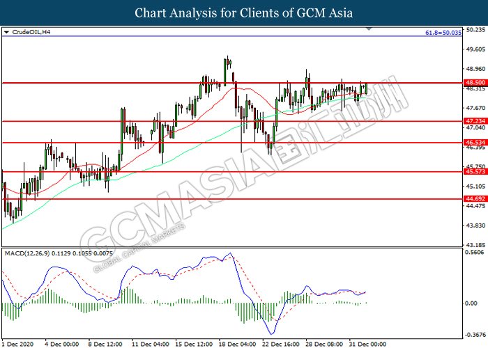 Bagi pasaran komoditi, harga minyak mentah telah melonjak sebanyak 0.05% ke $ 48.35 setong semasa penulisan di tengah-tengah perkembangan vaksin Covid-19 yang positif. Buat masa ini, Organization of Petroleum Exporting Countries (OPEC) dan sekutunya, termasuk Rusia akan mengadakan pertemuan maya pada hari Isnin. Oleh itu, para pelabur akan terus memantau perkembangan mengenai pertemuan tersebut dan juga vaksin Covid-19 untuk menerima isyarat dagangan selanjutnya. Sebaliknya, harga emas meningkat sebanyak 0.93% ke $1911.50 per troy auns susulan dengan penyusutan dalam Dolar AS.