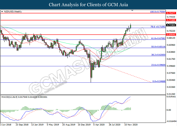NZDUSD, Weekly: NZDUSD telah didagang dengan lebih tinggi selepas ia memecah tahap rintangan terdahulu 0.7110. MACD yang memaparkan momentum bullish mencadangkan pasangan ini untuk melanjutkan keuntungannya ke arah tahap rintangan 0.7340.