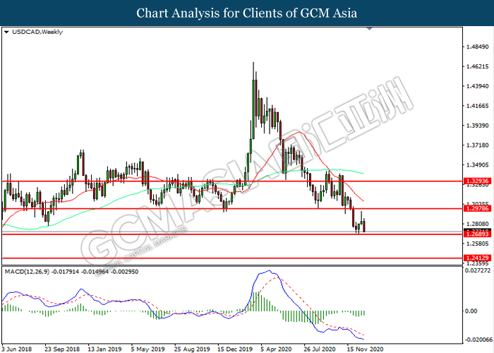 USDCAD, Weekly: USDCAD telah didagang dengan lebih rendah sementara kini menguji di tahap sokongan 1.2690. Namun, MACD yang memaparkan momentum bearish yang berkurangan mencadangkan pasangan ini untuk mengalami pembetulan teknikal bagi jangka pendek.