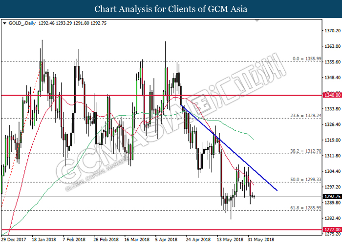 GOLD_, Daily: Harga emas telah menerima tekanan menurun yang ketara selepas ia berundur dari garisan trend menurun tersebut. Kedua-dua garisan MA yang masih melebar ke bawah mencadangkan harganya untuk meneruskan kerugian dan menuju ke arah tahap sokongan di 1285.95.