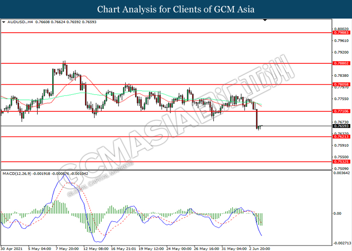 AUDUSD, H4: AUDUSD telah didagang dengan lebih rendah sementara kini berhampiran dengan tahap sokongan 0.7620. MACD yang memaparkan momentum bearish mencadangkan pasangan ini untuk melanjutkan kerugiannya selepas ia memecah tahap sokongan tersebut.