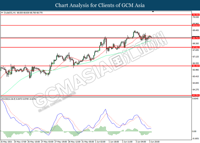 CrudeOIL, H1: Harga minyak mentah telah didagang dengan lebih rendah sementara kini menguji di tahap sokongan 68.70. Namun, MACD yang memaparkan momentum bearish yang berkurangan mencadangkan komoditi ini untuk mengalami pembetulan teknikal bagi jangka pendek.