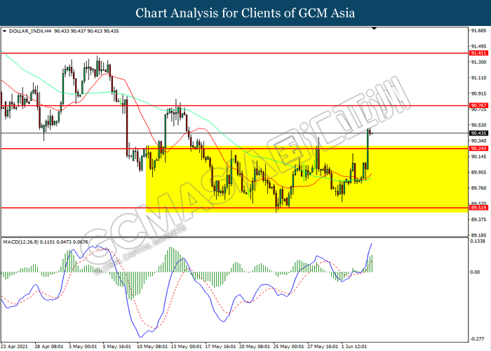 DOLLAR_INDX, H4: Indeks dolar telah didagang dengan lebih tinggi selepas ia memecah tahap rintangan terdahulu 90.25. MACD yang memaparkan momentum bullish mencadangkan indeks tersebut untuk melanjutkan keuntungannya ke arah tahap rintangan 90.75.