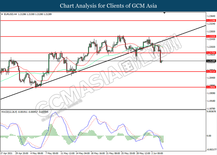 EURUSD, H4: EURUSD telah didagang dengan lebih rendah selepas ia berundur dari tahap sokongan terdahulu 1.2170. MACD yang memaparkan momentum bearish mencadangkan pasangan ini untuk melanjutkan kerugiannya ke arah tahap sokongan 1.2070.