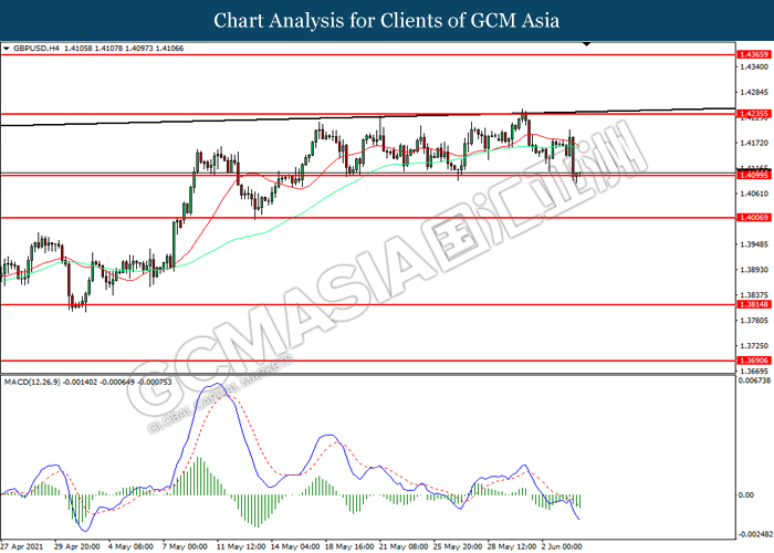 GBPUSD, H4: GBPUSD telah didagang dengan lebih rendah sementara kini menguji di tahap sokongan 1.4100. MACD yang memaparkan momentum bearish mencadangkan pasangan ini untuk melanjutkan kerugiannya selepas ia memecah tahap sokongan tersebut.