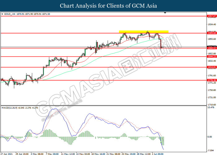 GOLD_, H4: Harga emas telah didagang dengan lebih rendah sementara kini menguji di tahap sokongan 1868.00. MACD yang memaparkan momentum bearish mencadangkan komoditi ini untuk melanjutkan kerugiannya selepas ia memecah tahap sokongan tersebut.