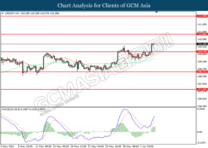 USDJPY, H4: USDJPY telah didagang dengan lebih tinggi selepas ia memecah tahap rintangan terdahulu 109.80. MACD yang memaparkan momentum bullish mencadangkan pasangan ini untuk melanjutkan keuntungannya ke arah tahap rintangan 110.90.