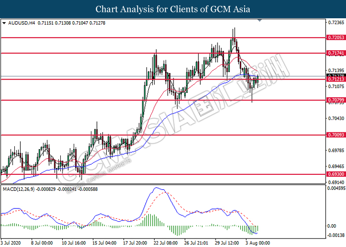 AUDUSD, H4: AUDUSD telah didagang dengan lebih tinggi sementara ia sedang menguji tahap rintangan di 0.7120. MACD yang memaparkan isyarat momentum bearish yang berkurangan mencadangkan pasangan ini untuk melanjutkan keuntungannya selepas ia berjaya memecah tahap rintangan tersebut.