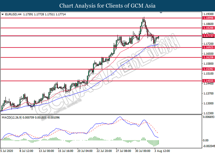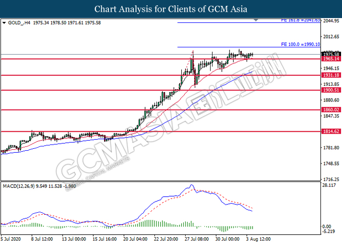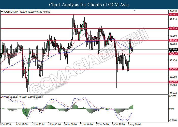 Di pasaran komoditi, harga minyak mentah telah meningkat sebanyak 0.14% kepada $ 40.75 setong susulan dengan harapan untuk pemulihan dalam permintaan minyak mentah. Oleh kerana data optimis yang menunjukkan pembuatan AS berkembang pada kadar terpantas sejak Mac 2019, peningkatan dalam aktiviti pembuatan dapat mendorong kepada penggunaan minyak mentah yang lebih tinggi, justerunya menyokong harga dengan lebih tinggi. Sebaliknya, harga emas tetap disokong dan meningkat sebanyak 0.03% kepada $ 1976.89 setong pada masa penulisan disebabkan oleh risiko berterusan dalam koronavirus dan kelemahan dolar.
