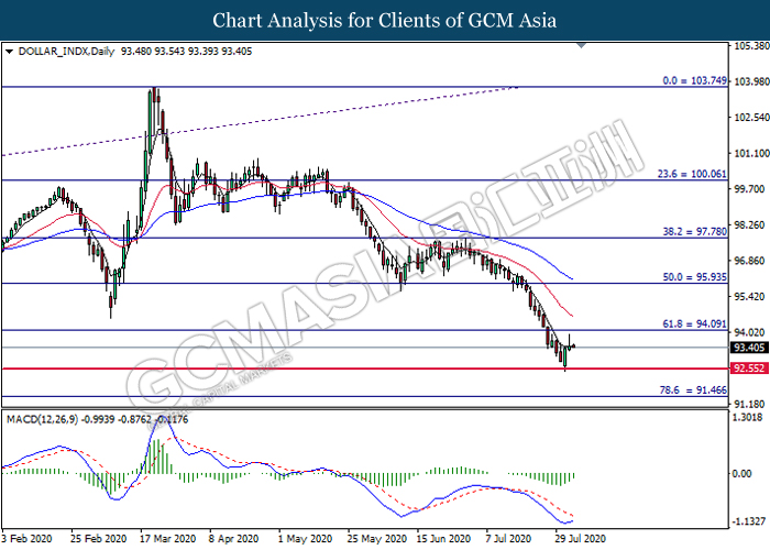 Indeks dolar yang didagang terhadap sebakul enam pasangan mata wang utama telah menghentikan pemulihannya dan jatuh semasa lewat sesi Asia susulan dengan data ekonomi yang optimis dan perkembangan yang perlahan dalam pakej rangsangan AS telah menyebabkan reaksi bercampuran sementara pasaran menunggu untuk kemajuan selanjutnya. Dari perspektif data, data ISM Manufacturing PMI telah meningkat kepada 54.2, lebih tinggi daripada jangkaan pasaran 53.6. Data tersebut berjaya memberikan sokongan untuk dolar AS tetapi momentumnya tidak dapat kekal lama kerana keputusan tersebut masih jauh di bawah tahap sebelum wabak. Sebaliknya, Presiden Fed Chicago, Charles Evans pada hari Isnin menyatakan bahawa bantuan seterusnya untuk ekonomi A.S. yang dilanda virus mesti datang dari dasar fiskal. Perunding Demokrat dan Rumih Putih juga telah menyatakan bahawa mereka telah mencapai sedikit kemajuan dalam perbincangan mengenai rangsangan koronavirus yang terbaru, namun bantuan pengangguran tetap menjadi halangan. Pada masa penulisan, indeks dolar telah jatuh sebanyak 0.03% kepada 93.46.