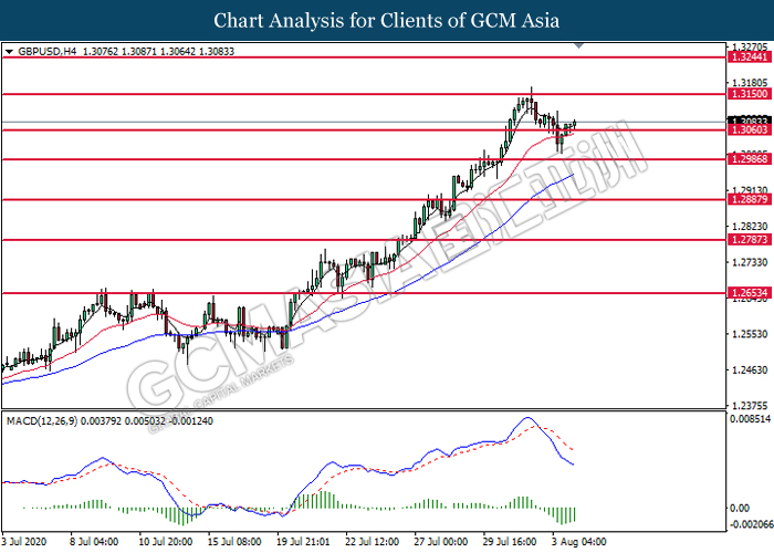 GBPUSD, H4: GBPUSD telah didagang dengan lebih tinggi selepas ia memecah tahap rintangan sebelumnya di 1.3060. MACD yang memaparkan isyarat momentum bearish yang berkurangan mencadangkan pasangan ini untuk didagang dengan lebih tinggi dan menuju ke arah tahap rintangan di 1.3150.