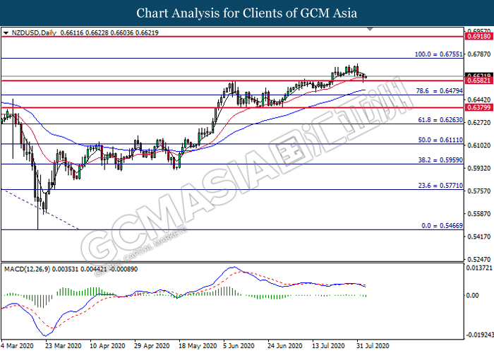 NZDUSD, Daily: NZDUSD telah didagang dengan lebih rendah selepas ia berundur dari tahap yang lebih tinggi. MACD yang menunjukkan isyarat momentum bullish yang berkurangan mencadangkan pasangan ini untuk melanjutkan kerugiannya dan menuju ke arah tahap sokongan di 0.6580.