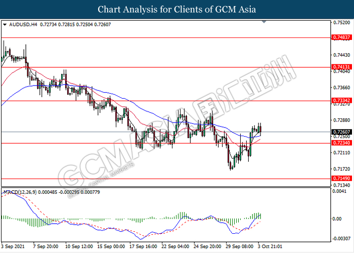 AUDUSD, H4: AUDUSD telah didagang dengan lebih tinggi susulan dengan pemecahan pada tahap rintangan sebelumnya 0.7235. MACD yang memaparkan isyarat bias bullish mencadangkan pasangan ini untuk melanjutkan keuntungannya ke arah tahap rintangan 0.7335.
