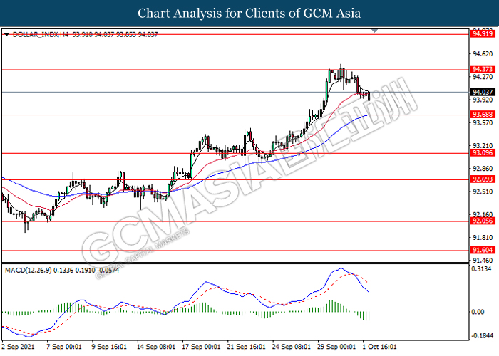 DOLLAR_INDX, H4: Indeks dolar telah didagang dengan lebih rendah susulan dengna pengunduran dari tahap rintangan 94.35. MAC yang memaparkan isyarat momentum bearish dengan formasi silang kematian mencadangkan dolar untuk melanjutkan kerugiannya ke arah tahap sokongan 93.70.
