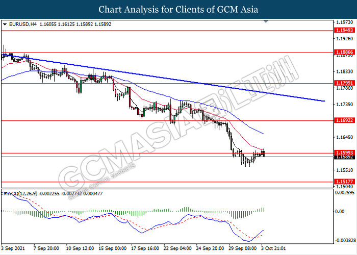 EURUSD, H4: EURUSD telah didagang dengan rata sementara ai sedang menguji tahap rintangan 1.1600. Namun, MACD yang memaparkan isyarat momentum bullish dengan formasi silang emas mencadangkan pasangan ini untuk melanjutkan keuntungannya selepas ia memecah tahap rintangan tersebut.