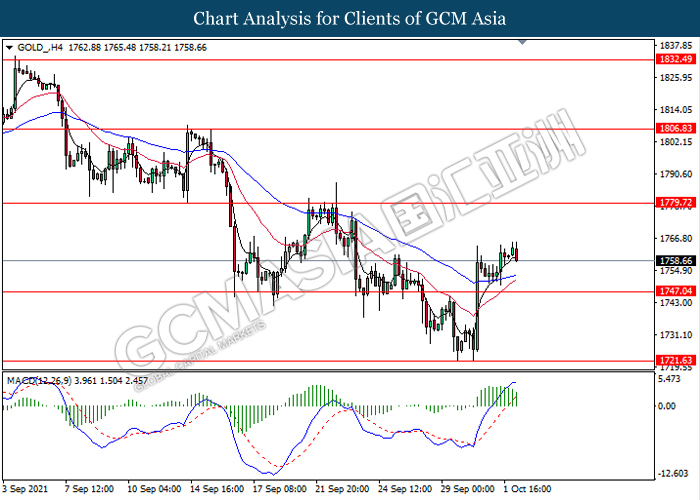GOLD, H4: Harga emas telah didagang dengan lebih tinggi susulan dengan lantunan dari tahap sokongan 1747.05. MACD yang memaparkan isyarat bias bullish mencadangkan komoditi ini untuk melanjutkan keuntungannya ke arah tahap rintangan 1779.70.