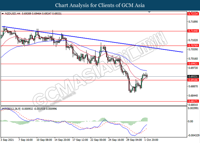 NZDUSD, H4: NZDUSD telah didagang dengan lebih tinggi susulan dengan pemecahan pada tahap rintangan sebelumnya 0.6915. MACD yang memaparkan isyarat momentum bullish mencadangkan pasangan ini untuk didagang melanjutkan keuntungannya ke arah tahap rintangan 0.6990.