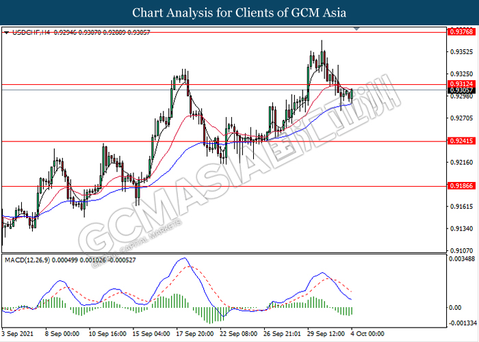 USDCHF, H4: USDCHF telah didagang dengan lebih rendah susuan dengan pemecahan pada tahap sokongan sebelumnya 0.9310. MACD yang memaparkan isyarat momentum bearish mencadangkan pasangan ini untuk melanjutkan kerugiannya ke arah tahap sokongan 0.9240.