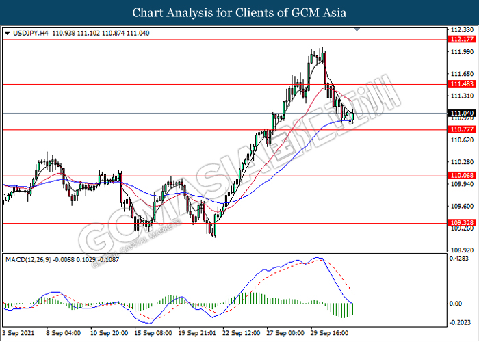 USDJPY, H4: USDJPY telah didagang dengan lebih rendah sementara ia sedang menguji berhampiran dengan tahap sokongan 110.75. Namun, MACD yang memaparkan isyarat momentum bearish yang berkurangan mencadangkan pasangan ini untuk didagang dengan lebih tinggi sebagai pembetulan teknikal ke arah tahap rintangan 111.50.
