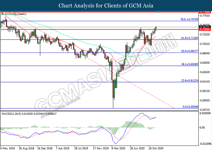 AUDUSD, Weekly: AUDUSD telah didagang dengan lebih tinggi selepas ia memecah tahap rintangan terdahulu 0.7570. MACD yang memaparkan momentum bullish mencadangkan pasangan ini untuk melanjutkan keuntungannya ke arah tahap rintangan 0.7570.