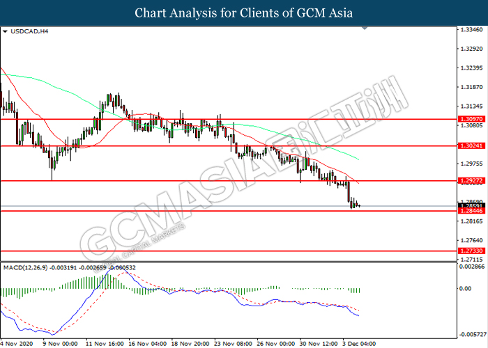 USDCAD, H4: USDCAD telah didagang dengan lebih rendah sementara kini menguji di tahap sokongan 1.2845. MACD yang memaparkan momentum bearish yang berkurangan mencadangkan pasangan ini untuk mengalami pembetulan teknikal bagi jangka pendek.