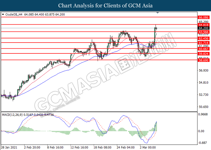 Di pasaran komoditi, harga minyak mentah meningkat 0.39% ke $64.22 setong ketika OPEC+ bersetuju untuk melanjutkan pelan pemotongan minyak mereka sekarang hingga bulan April. Dalam pertemuan OPEC, OPEC dan sekutunya mencapai kesepakatan di mana mereka memilih untuk tidak mengubah pelan pemotongan minyak mereka untuk bulan April, dengan alasan mereka bimbang bahawa wabak itu masih berkemungkinan melemahkan pemulihan permintaan minyak. Selain itu, harga emas turun 0.04% ke $1696.60 setroy ouns di tengah pengukuhan dolar AS.