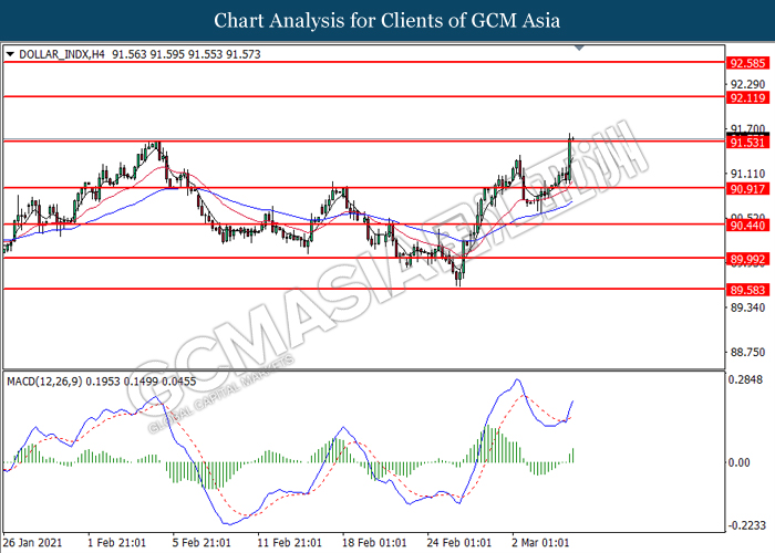 Indeks dolar yang mengukur nilainya berbanding sekumpulan enam mata wang utama berjaya melanjutkan kenaikannya semalam dan mengakhiri sesi pada tahap tertinggi dalam tempoh 3 bulan berikutan dengan kenyataan Pengerusi Rizab Persekutuan (Fed) Jerome Powell. Sebelumnya, Powell mendedahkan bahawa ada kemungkinan lonjakan kadar inflasi sementara kerana pembukaan semula ekonomi dapat menimbulkan tekanan ke atas harga barang dan perkhidmatan. Selain itu, Jerome Powell juga menyatakan bahawa beliau telah memperhatikan bahawa hasil perbendaharaan di AS telah meningkat dengan ketara dalam beberapa minggu terakhir, tetapi beliau juga menyebutkan bahawa Fed akan terus memerhatikan sebelum mengambil tindakan untuk mempengaruhi hasil bon yang berjangka panjang. Dengan latar belakang kenaikan kadar faedah dari para pelabur, Powell menjawab bahawa bank pusat AS akan “sabar” dan mengekalkan dasar monetari mereka sehingga kadar inflasi meningkat ke objektif mereka, iaitu berada di atas tahap yang berterusan pada 2%. Penyataan Powell akhirnya meningkatkan hasil perbendaharaan 10 tahun ke atas 1.5%, dan memberikan momentum kenaikan yang besar di pasaran dolar. Semasa sesi dagangan Asia, indeks dolar meningkat 0.74% ke 91.62.