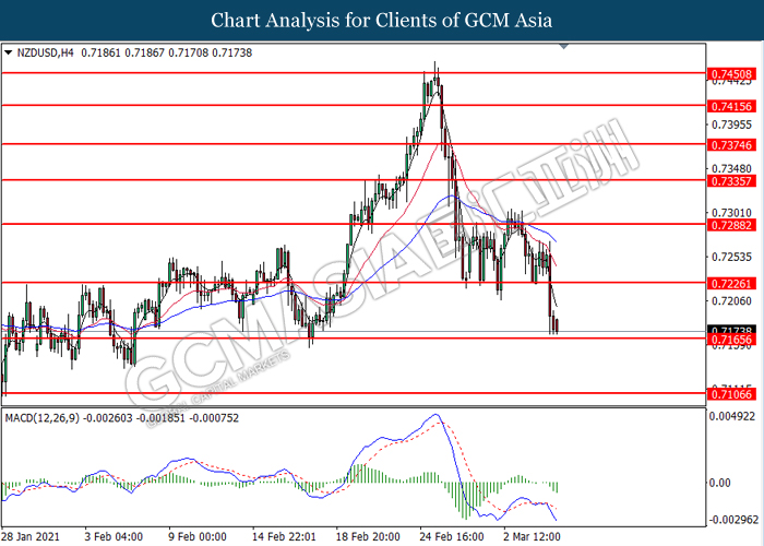 NZDUSD, H4: NZDUSD telah didagang dengan lebih rendah sementara ia sedang menguji tahap sokongan di 0.7165. MACD yang memaparkan isyarat momentum bearish yang berterusan mencadangkan pasangan ini untuk melanjutkan kerugiannya selepas ia memecah tahap sokongan tersebut.