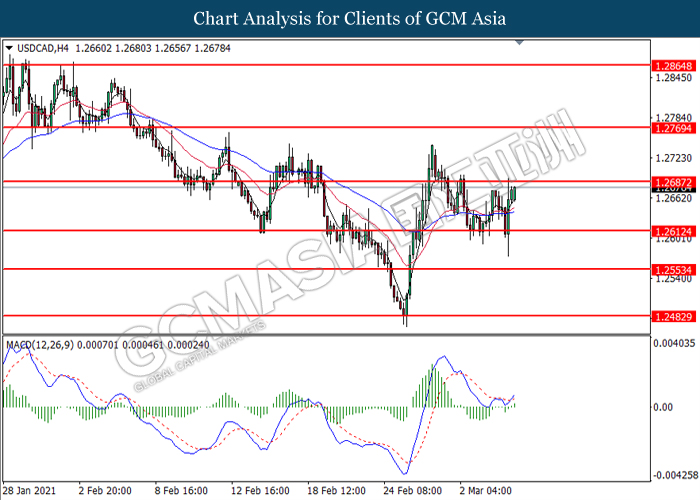 USDCAD, H4: USDCAD telah didagang dengan lebih tinggi selepas ia melantun dari tahap sokongan di 1.2610. MACD yang menunjukkan isyarat momentum bullish yang berterusan mencadangkan pasangan ini untuk didagang dengan lebih tinggi dan menuju ke arah tahap rintangan di 1.2685.