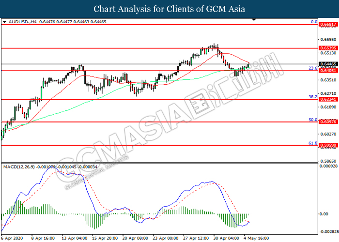 AUDUSD, H4: AUDUSD telah didagang dengan lebih tinggi selepas ia melantun dari tahap sokongan 0.6405. MACD yang memaparkan momentum bearish yang berkurangan mencadangkan pasangan ini untuk melanjutkan keuntungannya ke arah tahap rintangan 0.6540.