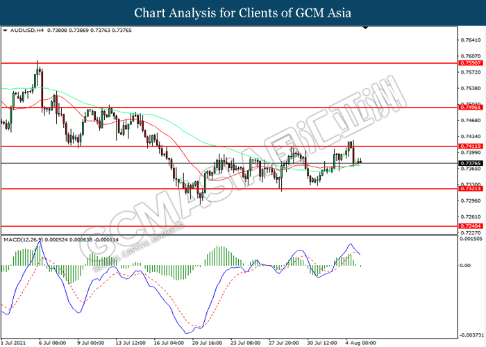 AUDUSD, H4: AUDUSD telah didagang dengan lebih rendah selepas ia berundur dari tahap rintangan 0.7410. MACD yang memaparkan momentum bearish mencadangkan pasangan ini untuk melanjutkan kerugiannya ke arah tahap sokongan 0.7320.
