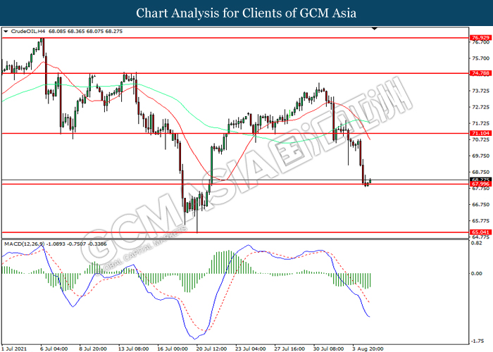 Bagi pasaran komoditi, harga minyak mentah telah menyusut sebanyak 0.35% ke $68.40 se tong semasa penulisan susulan dengan data inventori yang bearish. Menurut kepada Energy Information Administration (EIA), inventori minyak mentah A.S. telah memberi bacaan sebanyak 3.626M, lebih buruk daripada jangkaan pasaran sebanyak -3.102M. Sebaliknya, harga emas telah menyusut sebanyak 0.08% ke $1810.30 se troy auns susulan dengan peningkatan dalam Dolar AS.