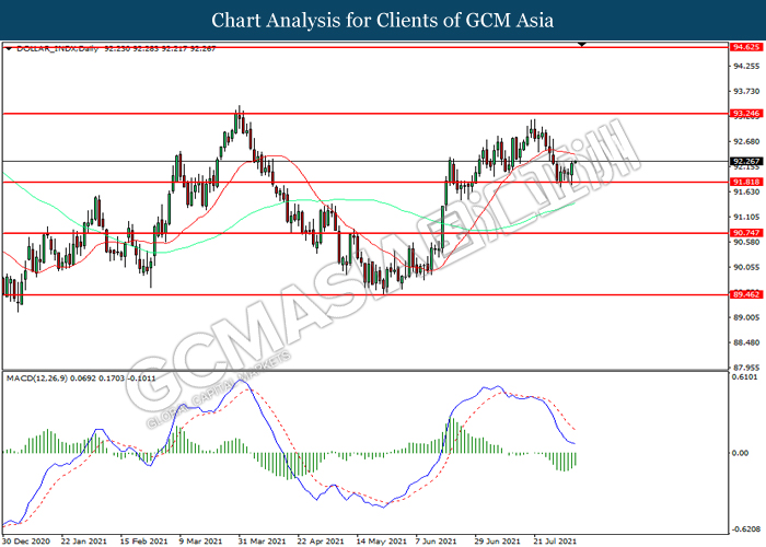 DOLLAR_INDX, Daily: Indeks Dolar telah didagang dengan lebih tinggi selepas ia melantun dari tahap sokongan 91.80. MACD yang memaparkan momentum bearish ayng berkurangan mencadangkan indeks tersebut untuk melanjutkan keuntungannya ke arah tahap rintangan 92.25.