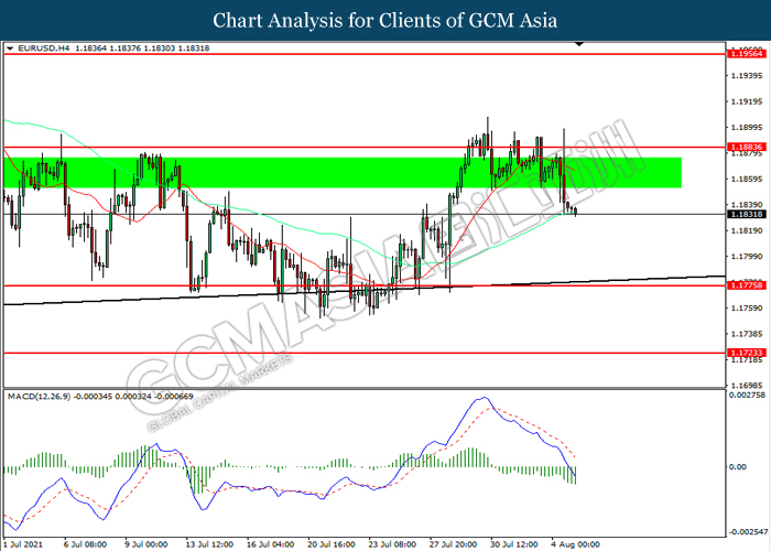 EURUSD, H4: EURUSD telah didagang dengan lebih rendah selepas ia berundur dari tahap rintangan 1.1885. MACD yang memaparkan momentum bearish mencadangkan pasangan ini untuk melanjutkan kerugiannya ke arah tahap sokongan 1.1775.