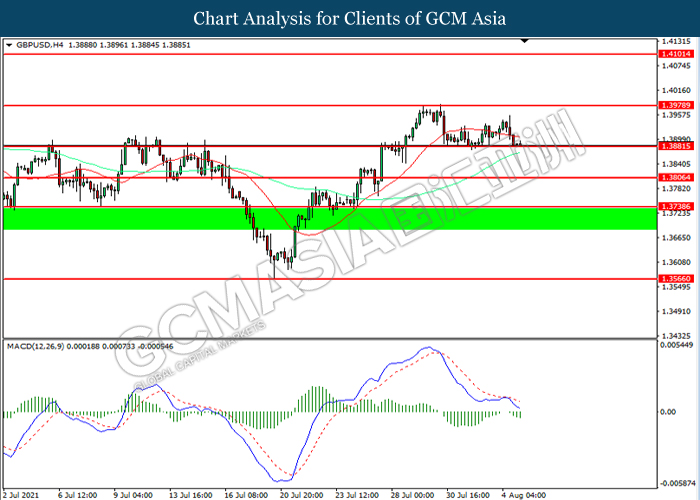 GBPUSD, H4: GBPUSD telah didagang dengan lebih rendah sementara kini menguji di tahap sokongan 1.3880. MACD yang memaparkan momentum bearish mencadangkan pasangan ini untuk melanjutkan kerugiannya selepas ia memecah tahap sokongan tersebut.