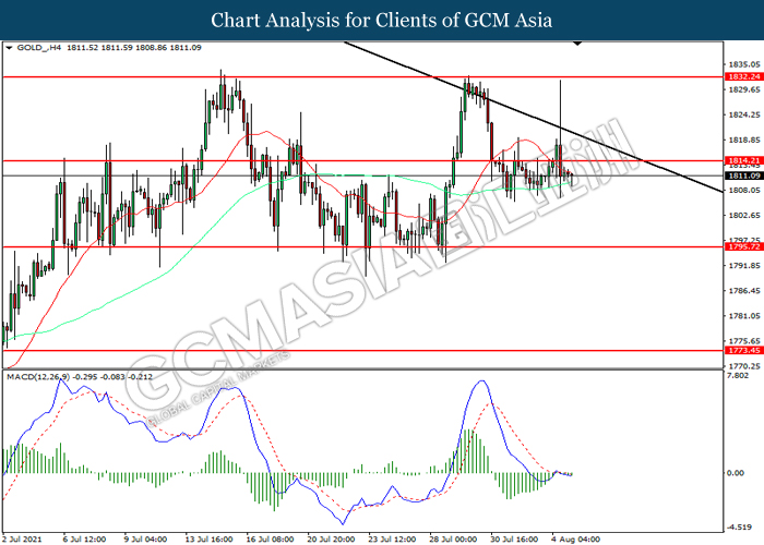 GOLD_, H4: Harga emas telah didagang dengan lebih rendah selepas ia memecah tahap sokongan terdahulu 1814.25. Namun, MACD yang memaparkan momentum bearish yang berkurangan mencadangkan komoditi ini untuk mengalami pembetulan teknikal bagi jangka pendek.
