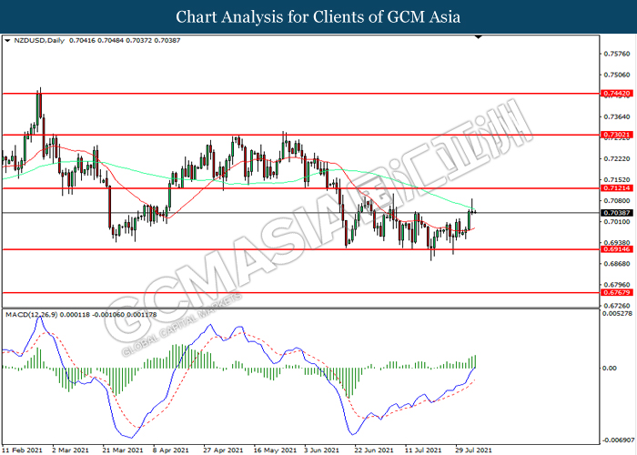 NZDUSD, Daily: NZDUSD telah didagang dengan lebih tinggi selepas ia melantun dari tahap sokongan 0.6915. MACD yang memaparkan momentum bullish mencadangkan pasangan ini untuk melanjutkan keuntungannya ke arah tahap rintangan 0.7120.