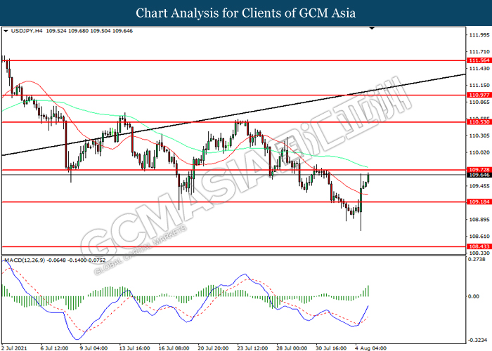 USDJPY, H4: USDJPY telah didagang dengan lebih tinggi sementara kini menguji di tahap rintangan 109.75. MACD yang memaparkan momentum bullish mencadangkan pasangan ini untuk melanjutkan keuntungannya selepas ia memecah tahap rintangan tersebut.