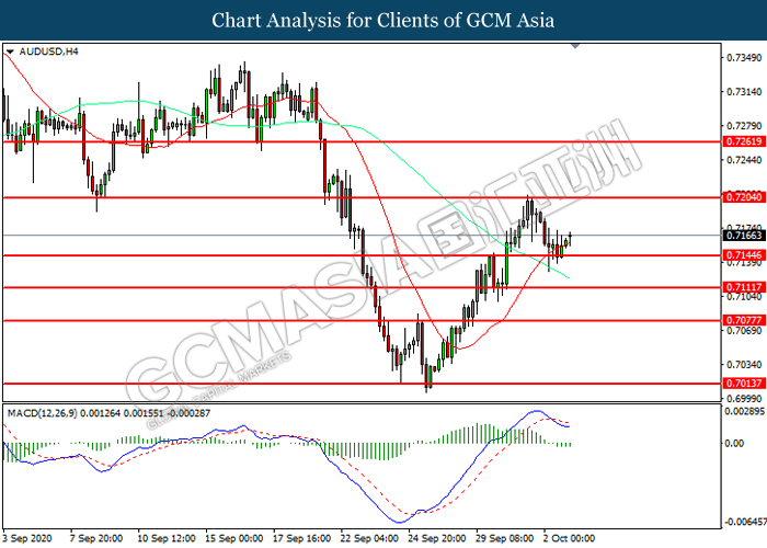 AUDUSD, H4: AUDUSD telah didagang dengan lebih tinggi selepas ia melantun dari tahap sokongan 0.7145. Namun, MACD yang memaparkan momentum bearish mencadangkan pasangan ini untuk mengalami pembetulan teknikal bagi jangka pendek.