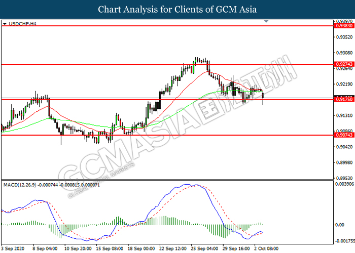 USDCHF, H4: USDCHF telah didagang dengan lebih rendah sementara kini menguji di tahap sokongan 0.9175. MACD yang memaparkan momentum bullish yang berkurangan mencadangkan pasangan ini untuk melanjutkan kerugiannya selepas ia memecah tahap sokongan tersebut.